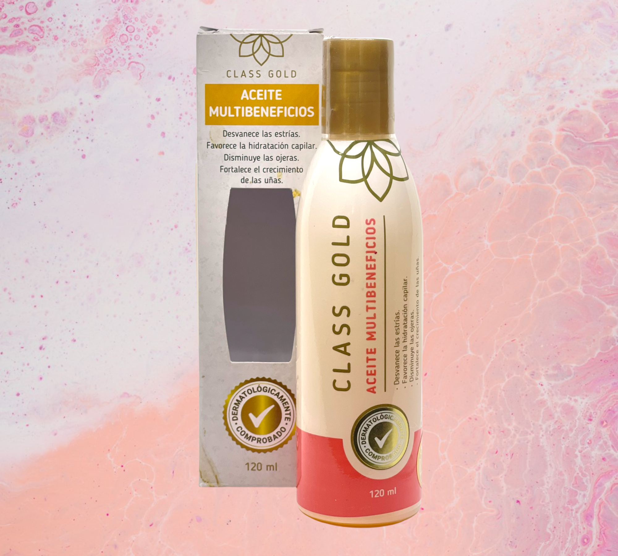 The CLASS GOLD Multi-Benefit Oil helps reduce and prevent stretch marks, stimulates hair, lash, and brow growth, strengthens nails, and diminishes dark circles, all in one product.